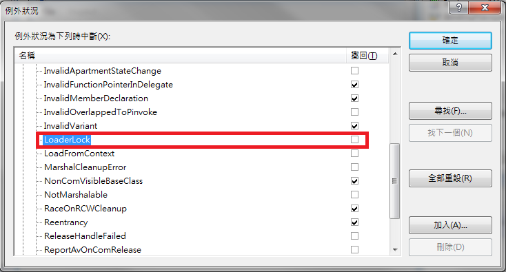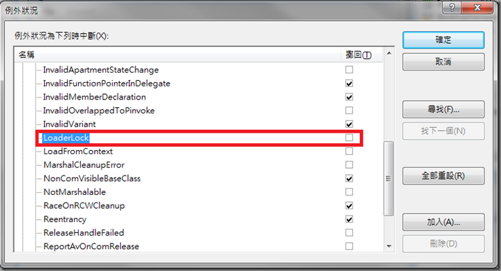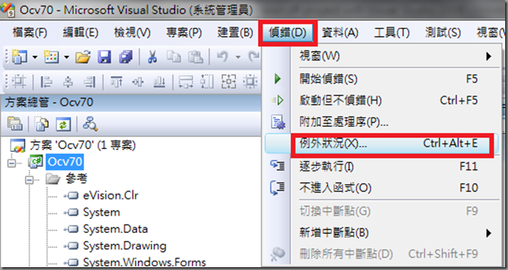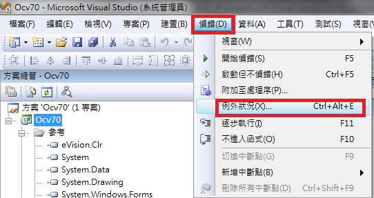 Step 4. Select exception conditions<例外狀況> in the debug menustrip
