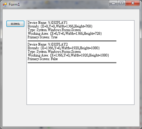 6: listBox1.Items.Add("Device nAME: " + screen.DeviceName);