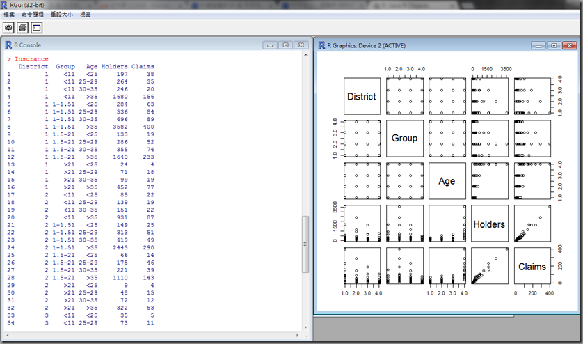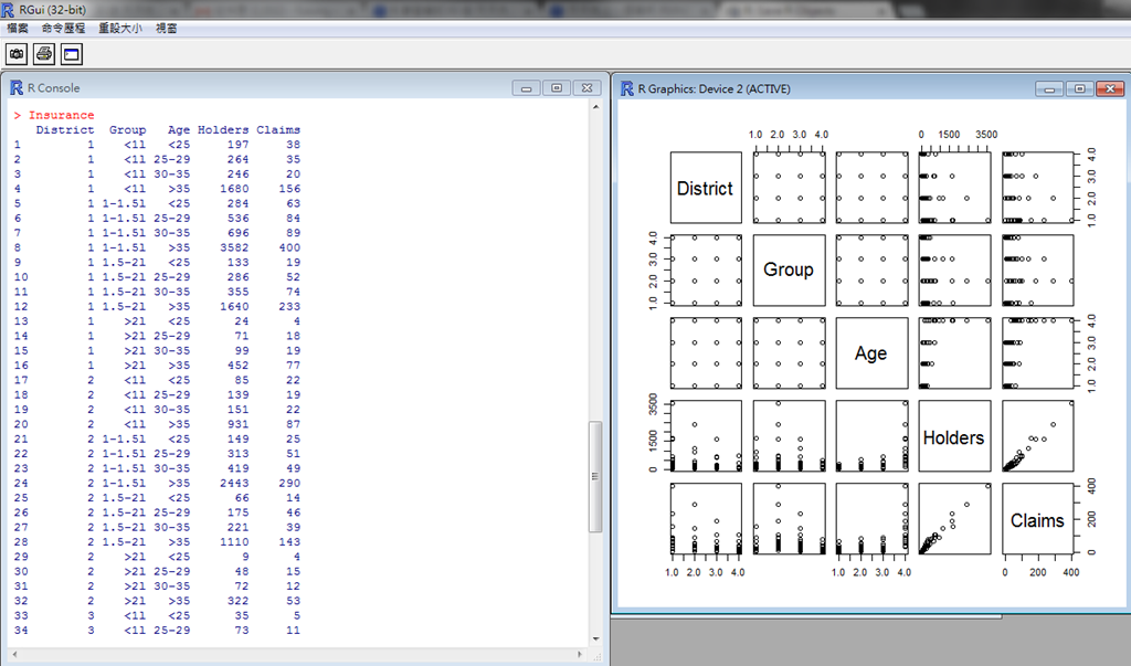 1: > levels(Insurance$Age) = c("少年","青年","成人","中年")
