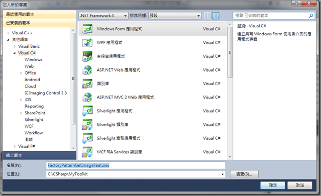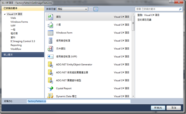 選擇該FactoryPatternGetImageFeatures專案, 滑鼠右鍵 <加入><新增項目>