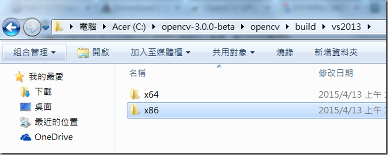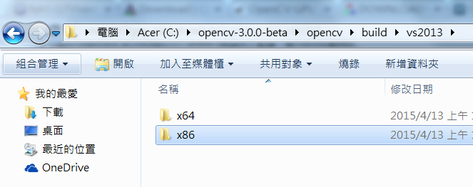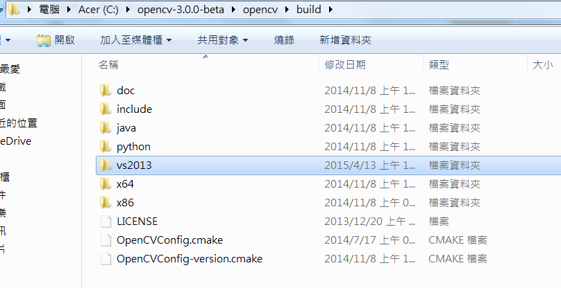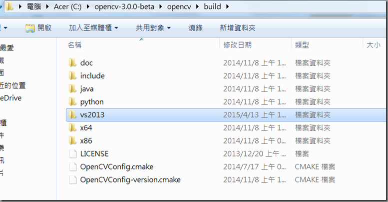 在C:\opencv-3.0.0-beta\opencv\build\目錄夾下創建一個vs2013資料夾