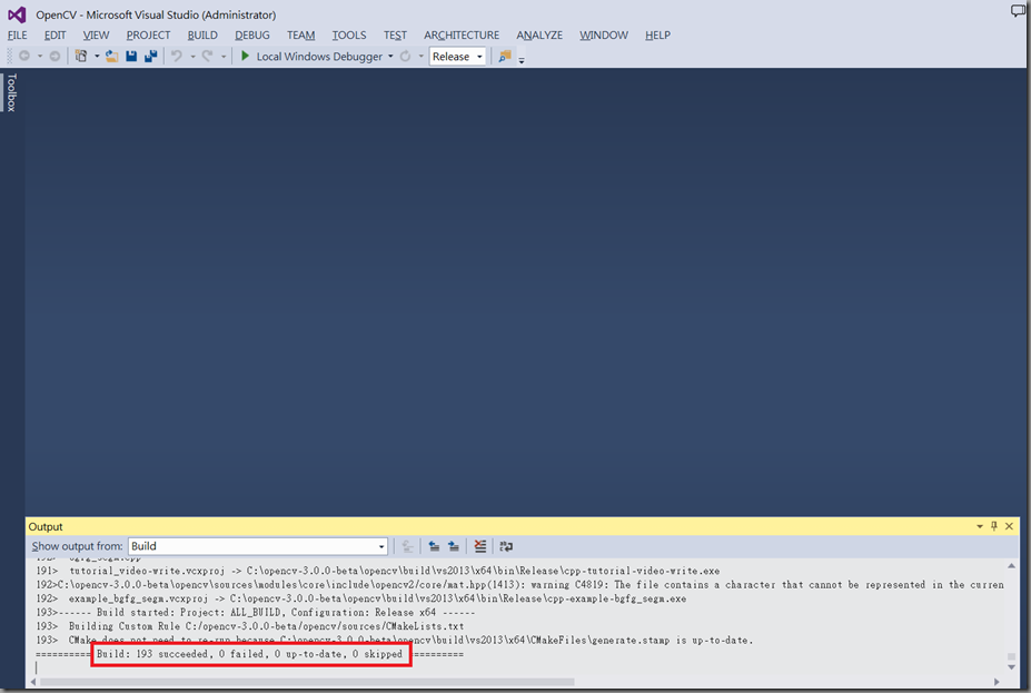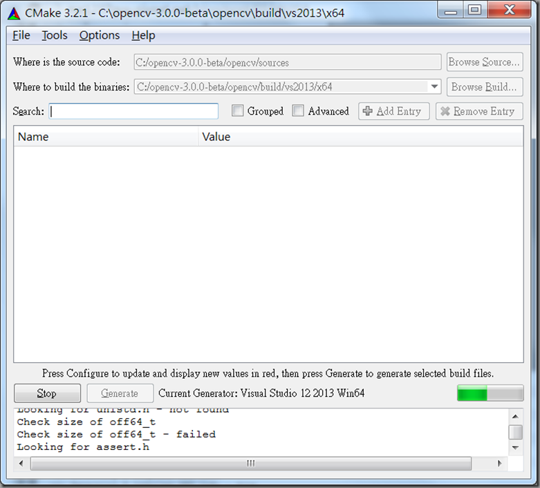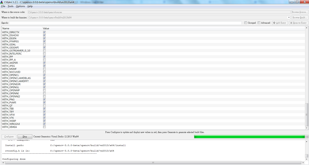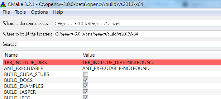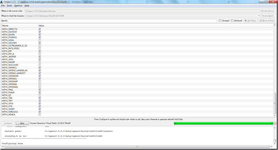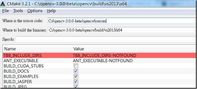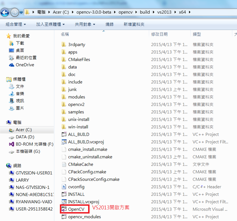 如果沒有甚麼意外, Visual Studio 2013專案應該會輸出到 C:\opencv-3.0.0-beta\opencv\build\vs2013\x64