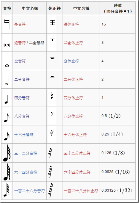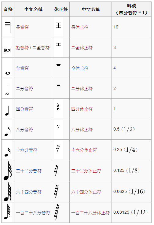 這張表很清楚說明全音符, 二分音符, 四分音符, 八分音符, 十六分音符的音符時值關係(切分成2的倍數)