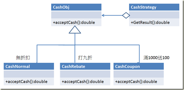 2.以相同的方法(GetResult)調用所有的演算法(CashNormal、CashRebate、CashRebate),減少了各種演算法類別與使用演算法類別之間的耦合。