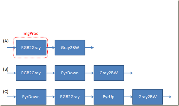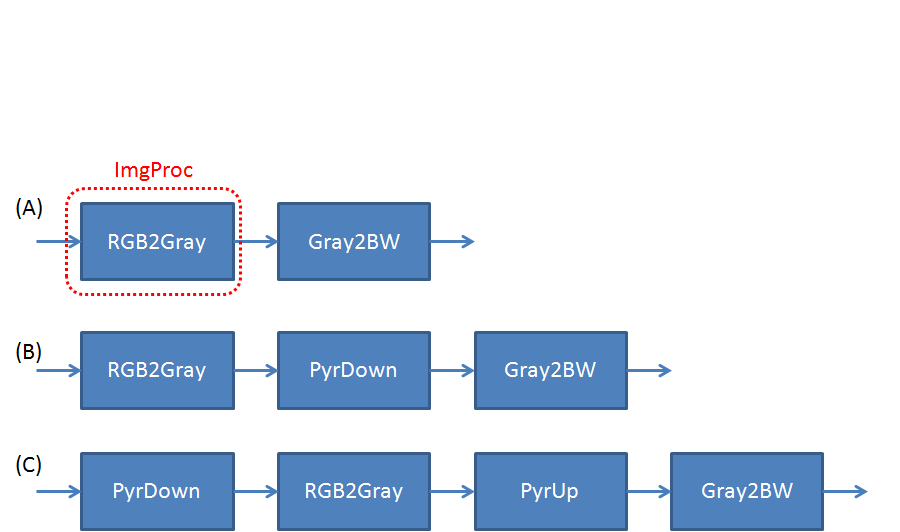 下圖(A)、(B)、(C)是一般影像處理常見的處理手法,如何撰寫ImgProc blockset讓影像資料,可以像是串流般一直往下進行,本篇將撰寫一個應用範例:將各個獨立影像模組(module)如同積木般堆疊、依照所需要的順序串接,且不限制積木的個數;過程中還能隨時觀看處理前後的結果,甚至恢復上一步(Undo)。