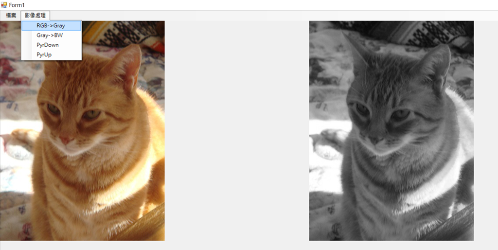 6: { 7: ip.LoadImage(ofd.FileName); 8: ip.SetSrcImageBox(imageBox1); 9: ip.SetDstImageBox(imageBox2); 10: ip.ShowSrcImage(); 11: ip.ShowDstImage(); 12: } 13: } 14: }RGB->Gray