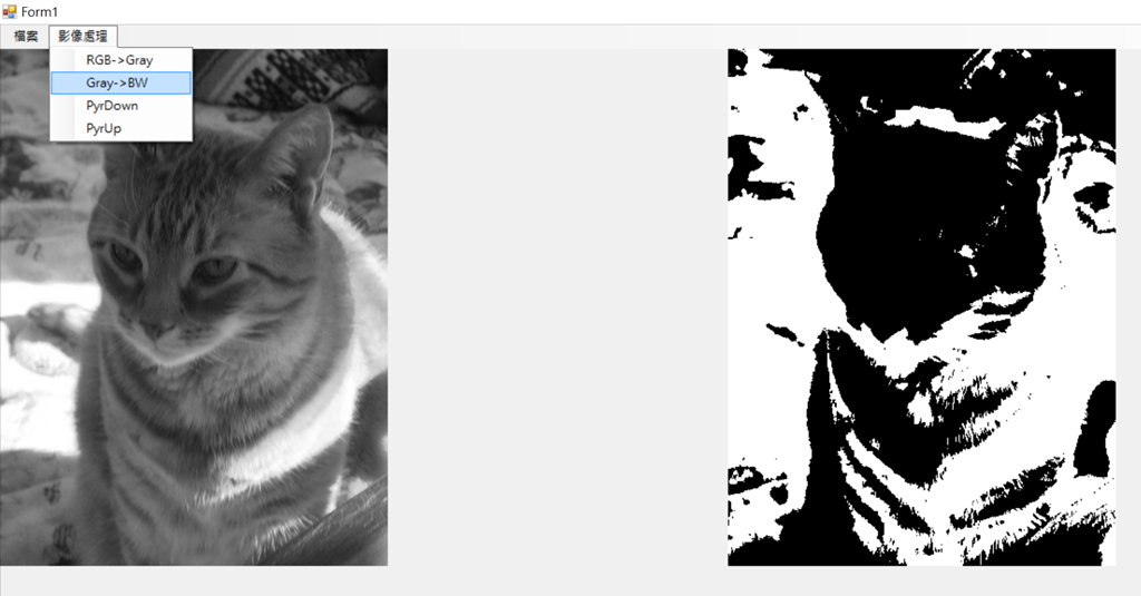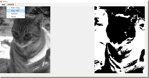 20: { 21: CvInvoke.Threshold(m_ip.SourceImage, m_ip.TargetImage, m_thresh, 255, ThresholdType.Binary); 22: } 23: }24: class PyrDown : ImgProcDecorator