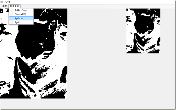 4: gray2bw.Decorate(ip); 5: ip.ShowSrcImage(); 6: ip.ShowDstImage(); 7: }PyrDown
