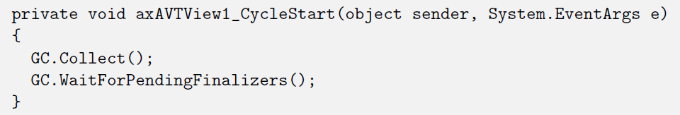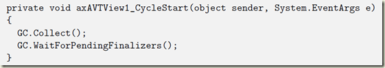 ActivVisionTool是好幾年前的影像量測工具, 下面這段範例程式看起來像是原廠底層activeX元件沒寫好, 竟然要寫一個GC.Collect()在自身的Live取像程式Event內, 不加入就會發生memory leakage喔!