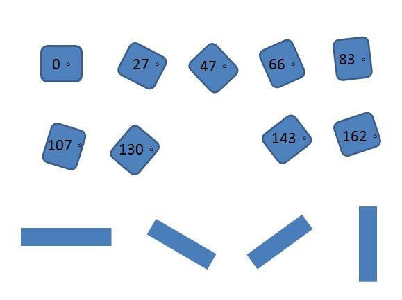 豎立著的矩形為0度;接著順時鐘轉54度, 然後橫躺矩形為90度;最後轉到120度