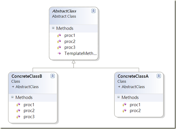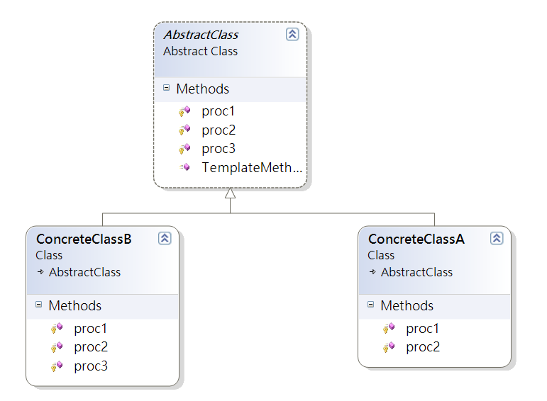 ConcreteClassA和ConcreteClassB分別繼承AbstractClass,因此需要覆寫(override)剛剛父類別的抽象方法:包含3個步驟proc1()、proc2()、proc3();