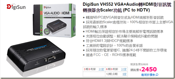 DigiSun VH552 VGA+Audio轉HDMI影音訊號轉換器含Scaler功能 (PC to HDTV)