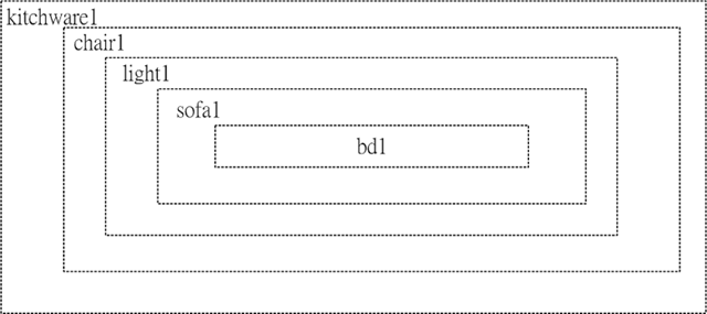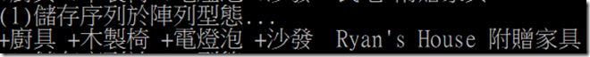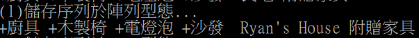 3. 列印最後一個物件bdList2[bdList.Length-1],即列印廚具,而廚具包含(木製椅),木製椅又包含(電燈泡),電燈泡又包含(沙發),沙發又包含(Ryan’s House),因此物件鏈可以一路直行列印動作…。