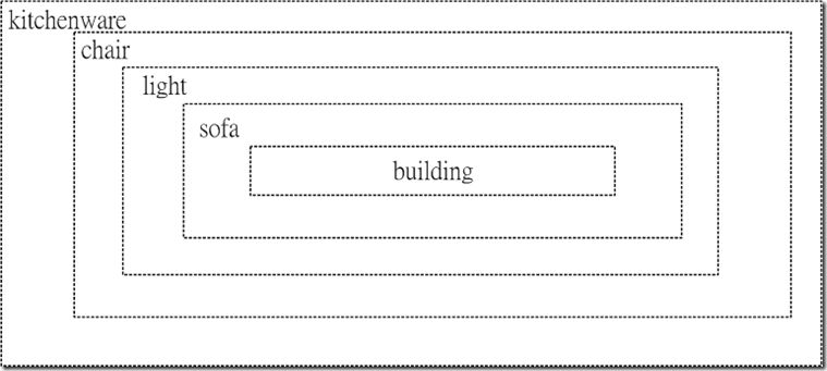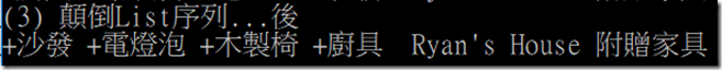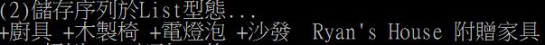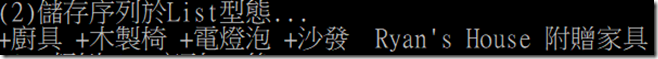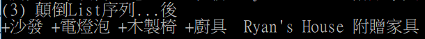 3. 列印最後一個物件bdList[bdList.Count-1],即列印廚具,而廚具包含(木製椅),木製椅又包含(電燈泡),電燈泡又包含(沙發),沙發又包含(Ryan’s House),因此物件鏈可以一路執行列印動作…。
