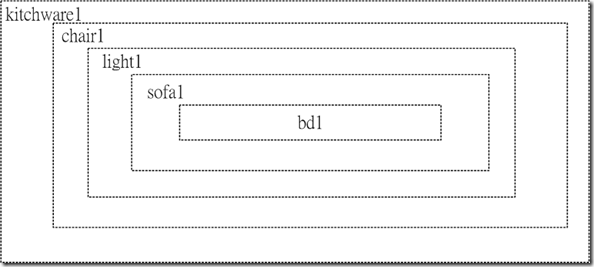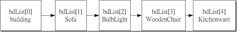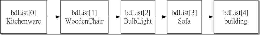 3. 列印最後一個物件bdList2[bdList.Length-1],即列印沙發,而沙發包含(電燈泡),電燈泡又包含(木製椅),木製椅又包含(廚具),廚具又包含(Ryan’s House),因此物件鏈可以一路直行列印動作…。