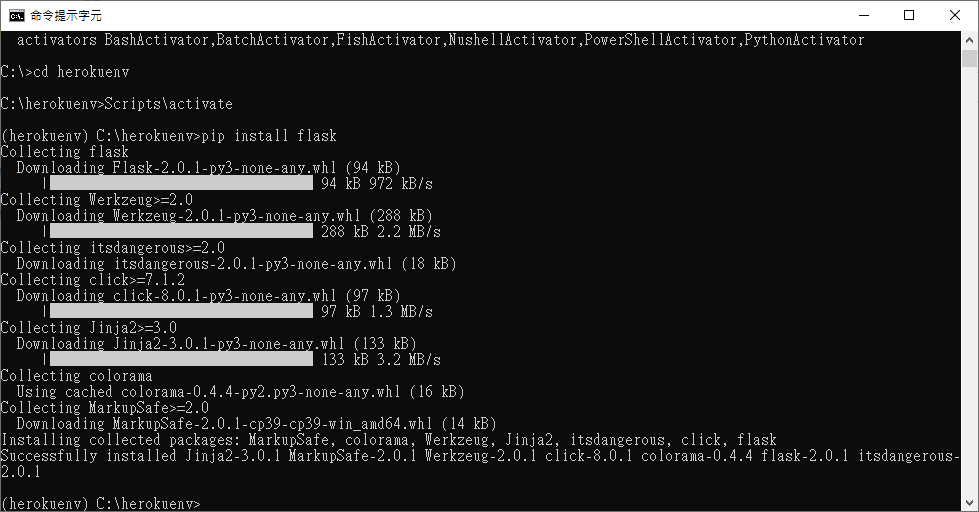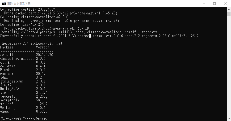 remote: Successfully installed Flask-2.0.1 Jinja2-3.0.1 MarkupSafe-2.0.1 Werkzeug-2.0.1 certifi-2021.5.30 charset-normalizer-2.0.6 click-8.0.1 colorama-0.4.4 gunicorn-20.1.0 idna-3.2 importlib-metadata-4.8.1 itsdangerous-2.0.1 requests-2.26.0 typing-extensions-3.10.0.2 urllib3-1.26.7 zipp-3.5.0