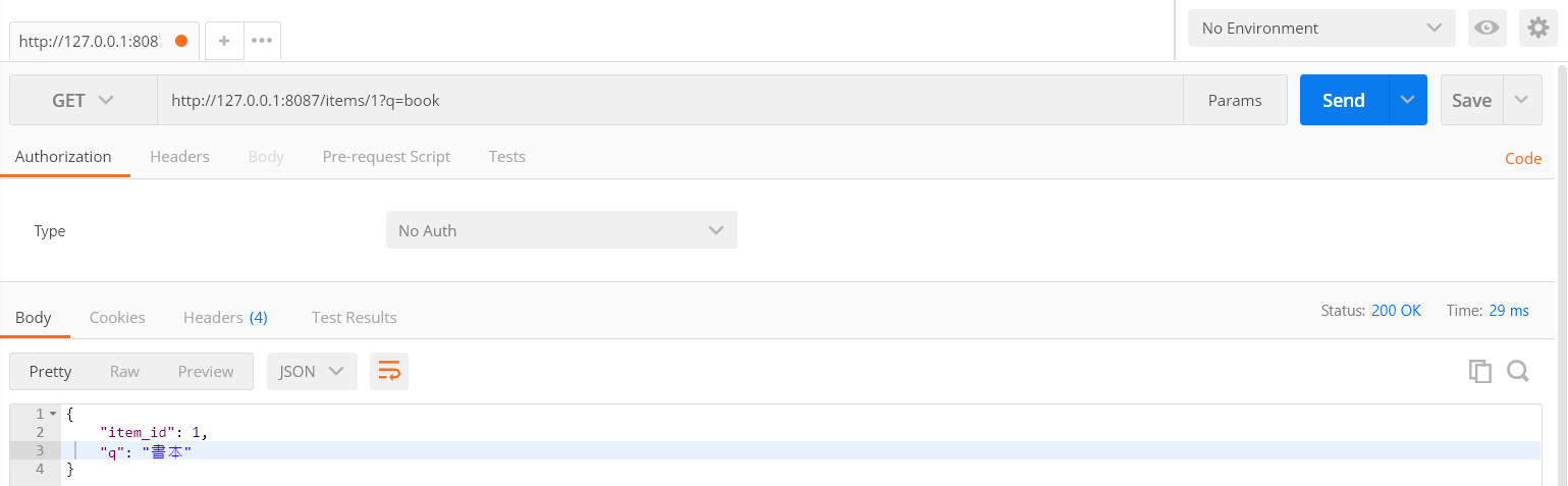 The server responded with item_id =1 and q ='書本'