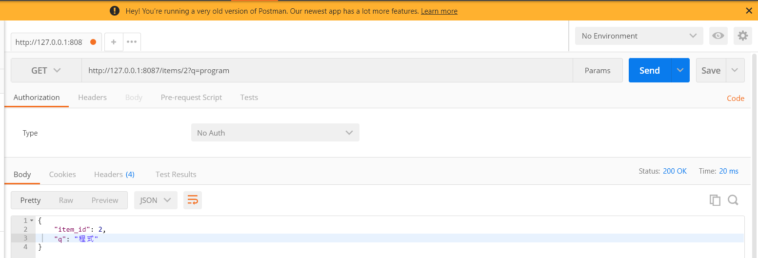 The server responded with item_id =2 and q ='程式'