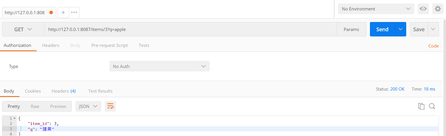 The server responded with item_id =3 and q ='蘋果'