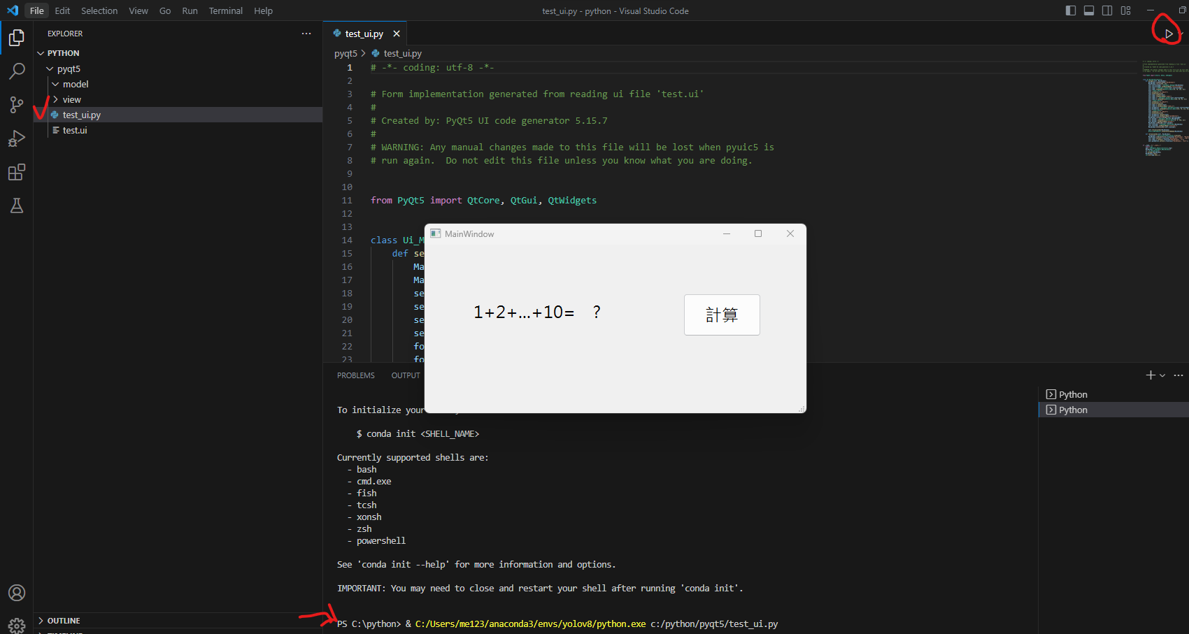 滑鼠雙擊開啟test_ui.py並按下右上角執行按鈕
