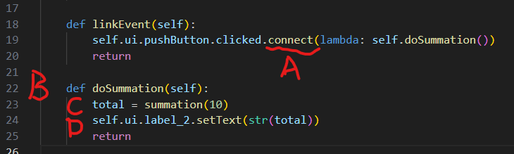 A: 註冊事件: 先自訂義一個doSummation方法,透過connect將pushButton點擊事件關聯至doSummation
