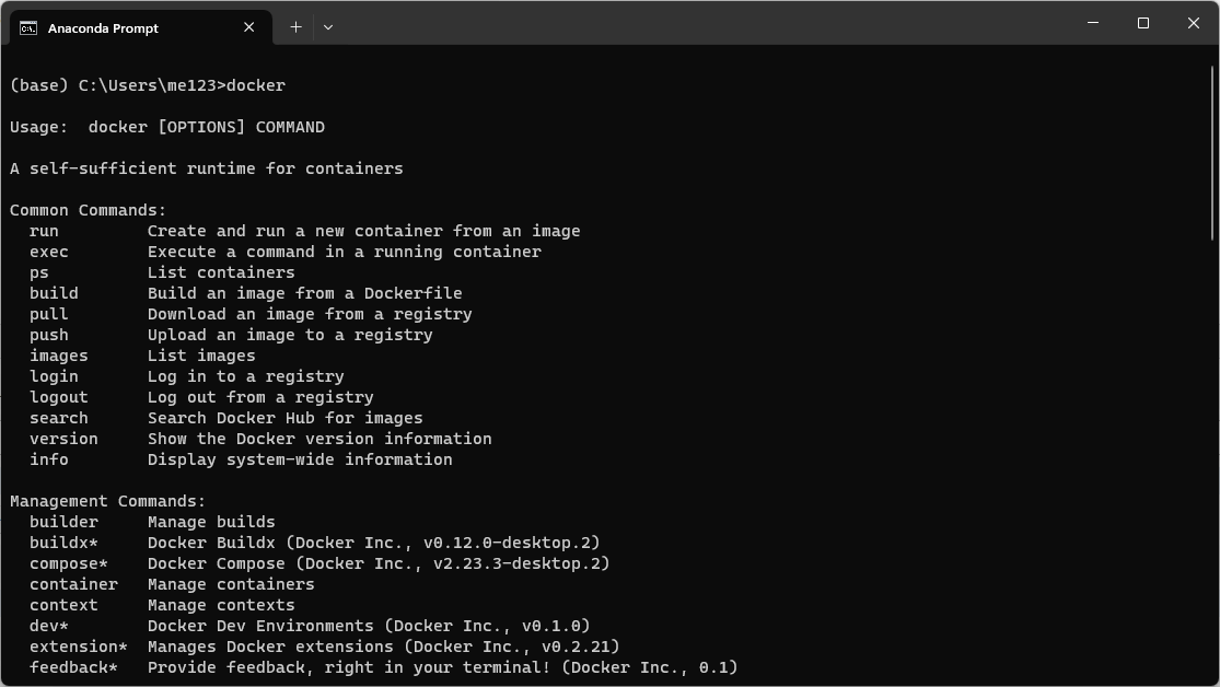 如果有安裝成功,則可以跑出下列畫面;如果不認得docker指令表示安裝失敗