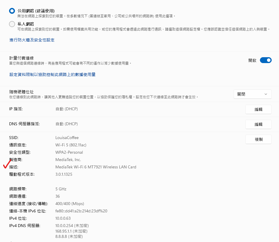 確認WiFi硬體裝置名稱:MediaTek Inc