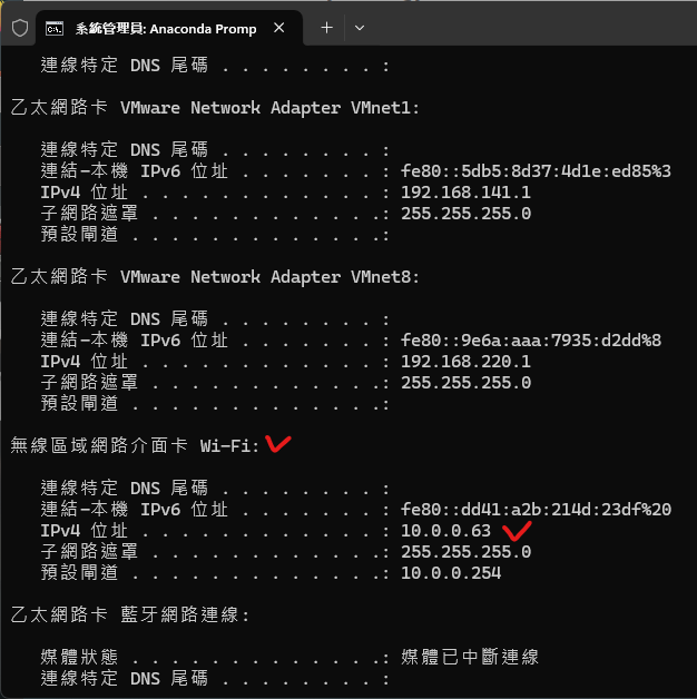 本地電腦的無線區域網路介面卡 Wi-Fi: 10.0.0.63