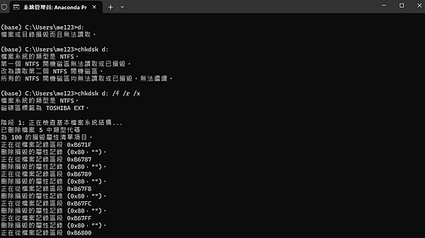 > chkdsk d: /f /r /x