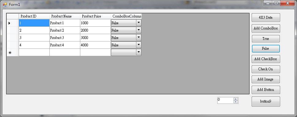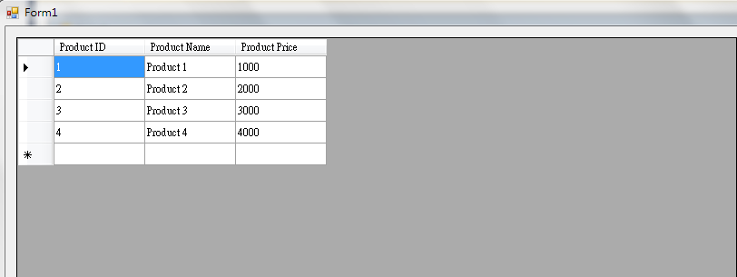 11: dataGridView1.Rows.Add(row);12: row = new string[] { "3", "Product 3", "3000" };