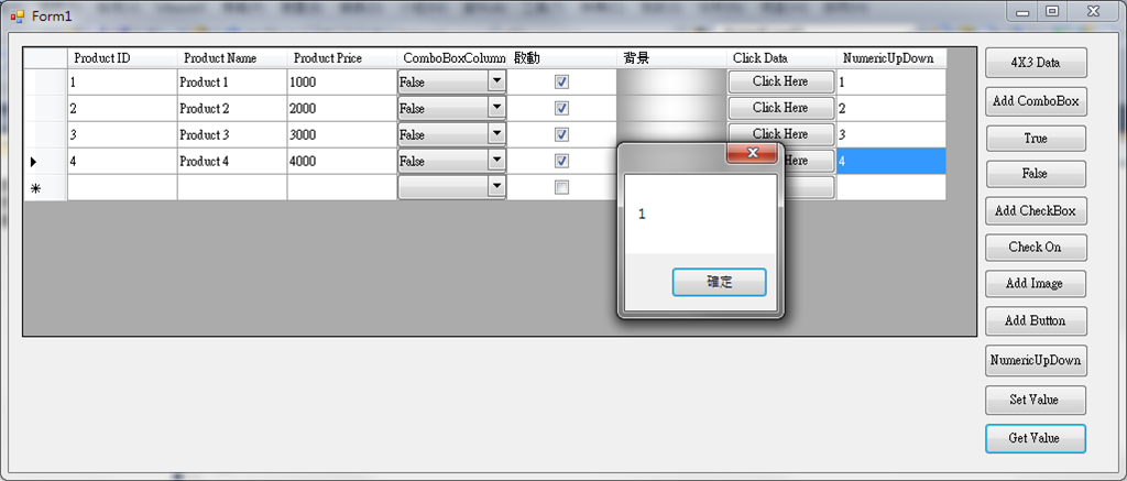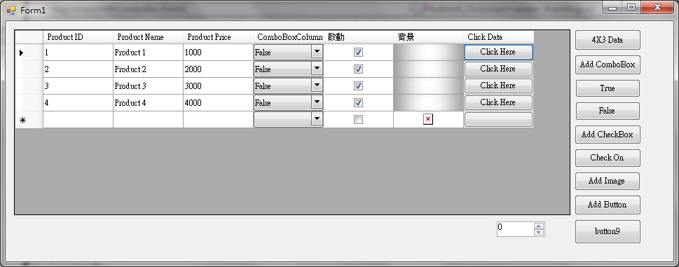 15: dataGridView1.Rows.Add(row); 16: }執行結果